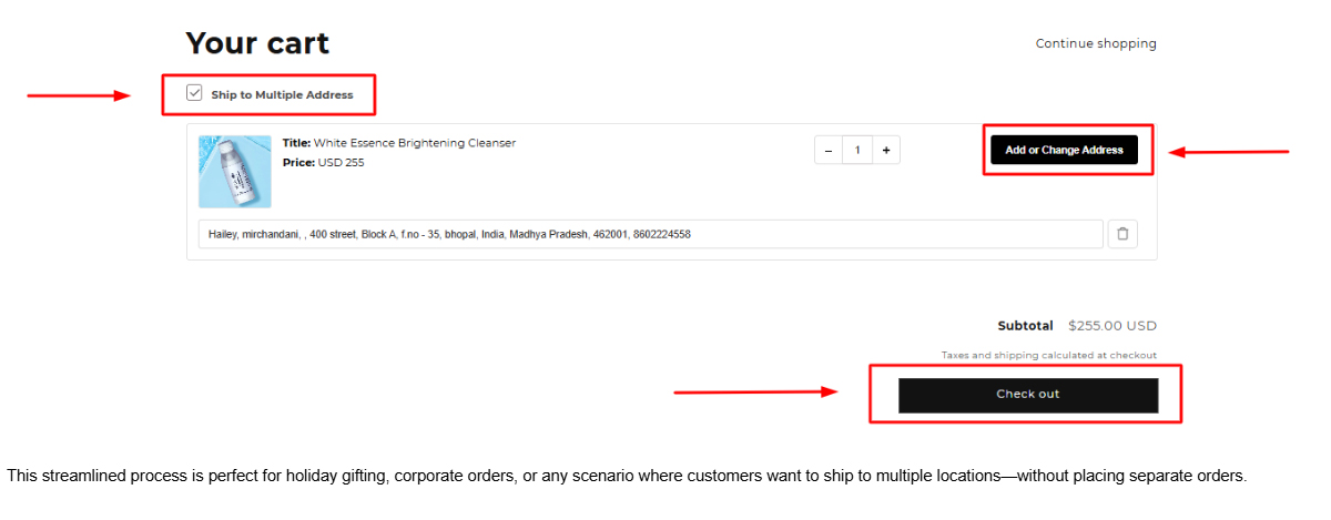 This feature makes it simple to handle bulk or gift deliveries—sending the same product to multiple addresses with varying quantities, all within one seamless checkout.